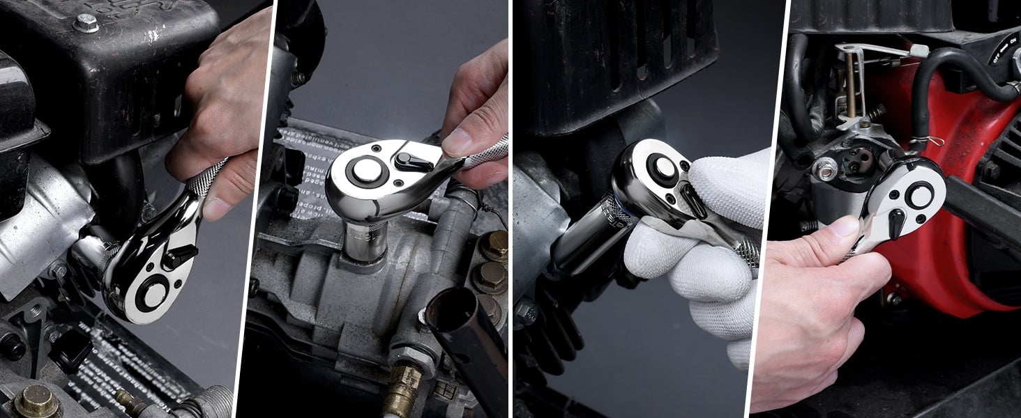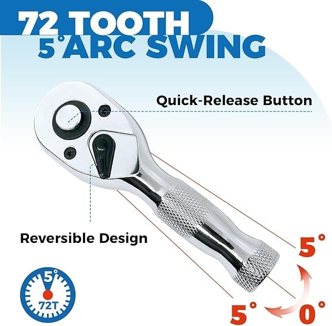 Reversible 72 tooth head, 5° ratcheting arc allows you to turn fasteners in tight spaces. The quick-release reversible head, replaced the socket by touching the middle part, and changed the driving direction by flipping the biased drive switch.