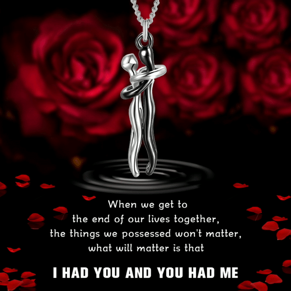 The design of the necklace pendant looks like two lovers hugging each other.